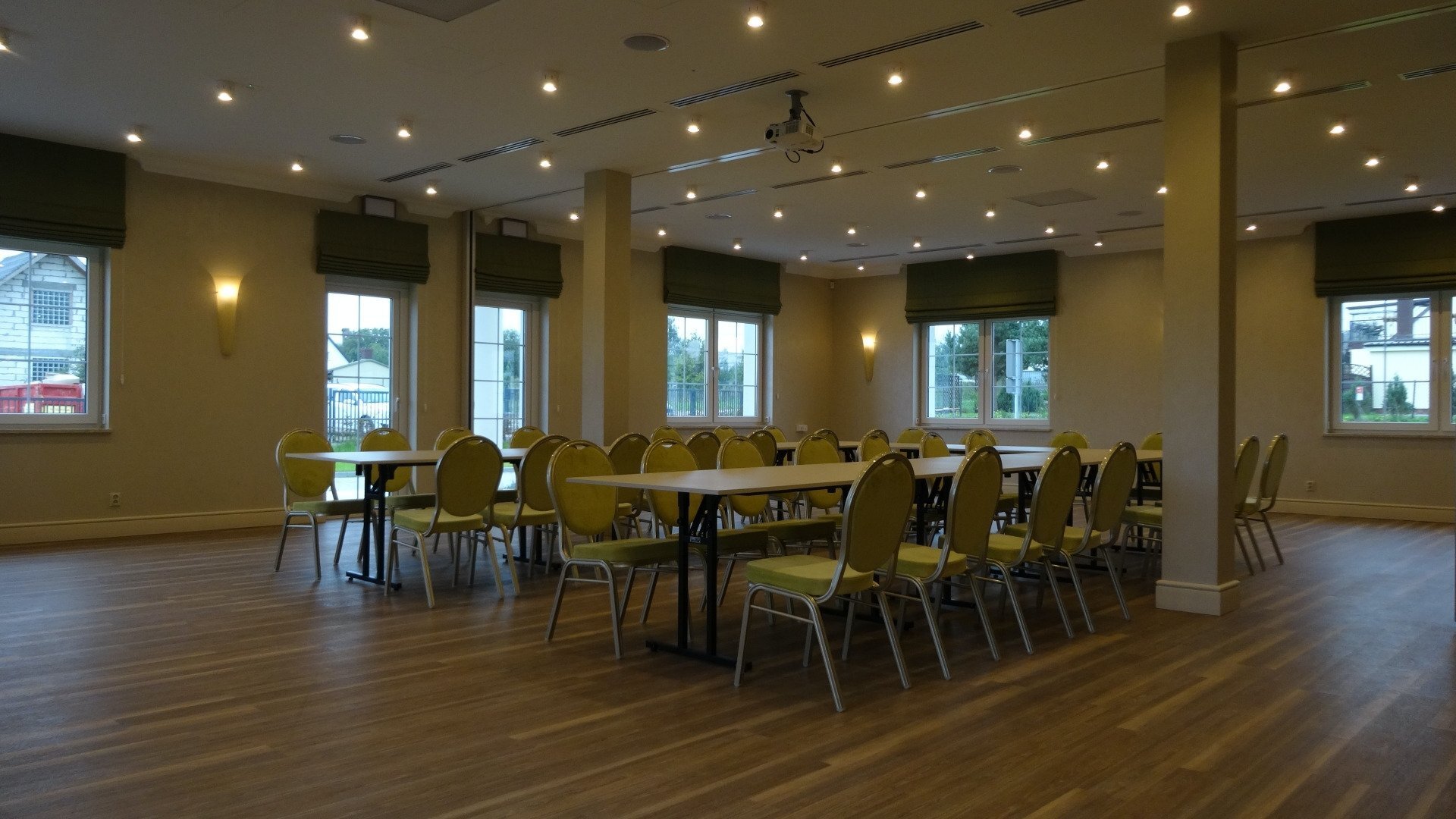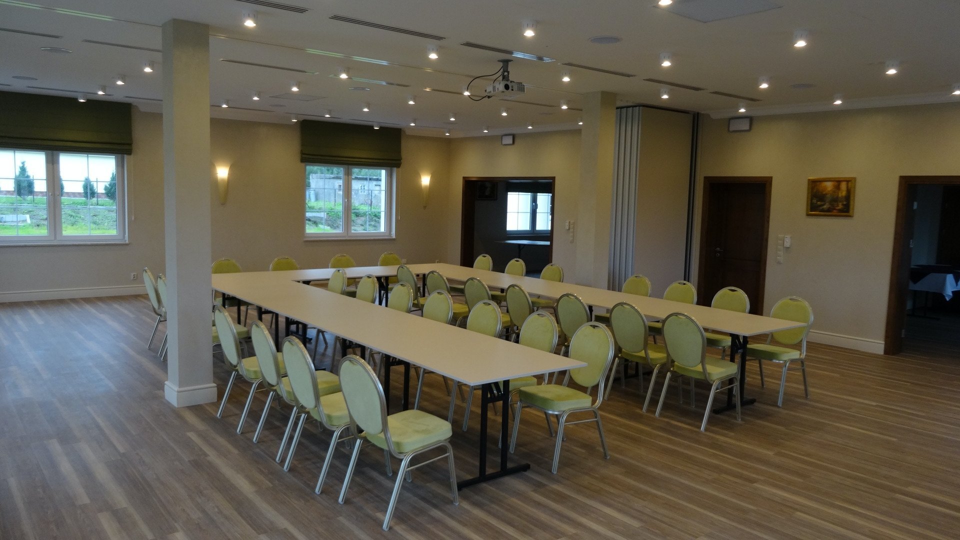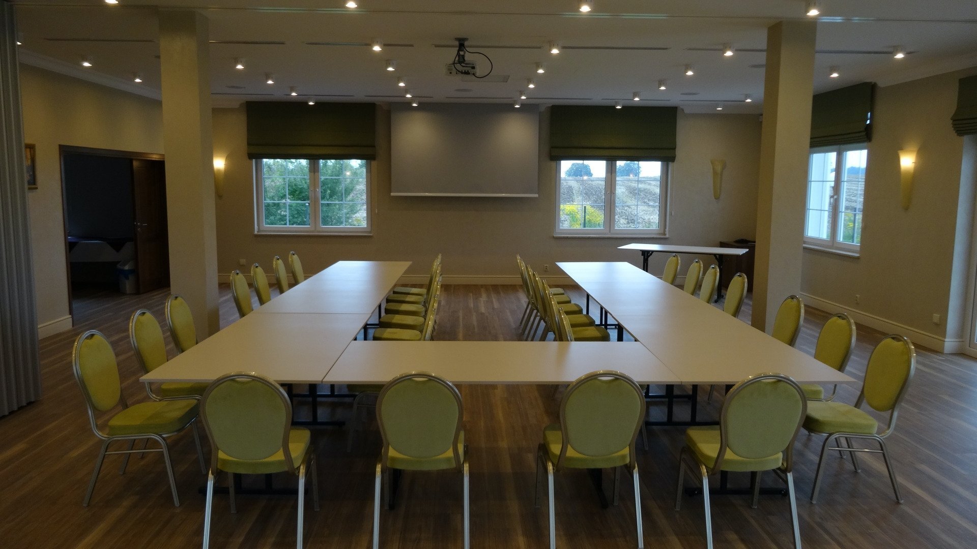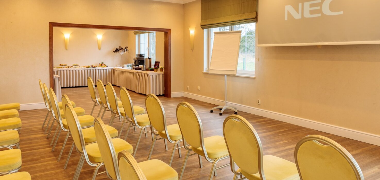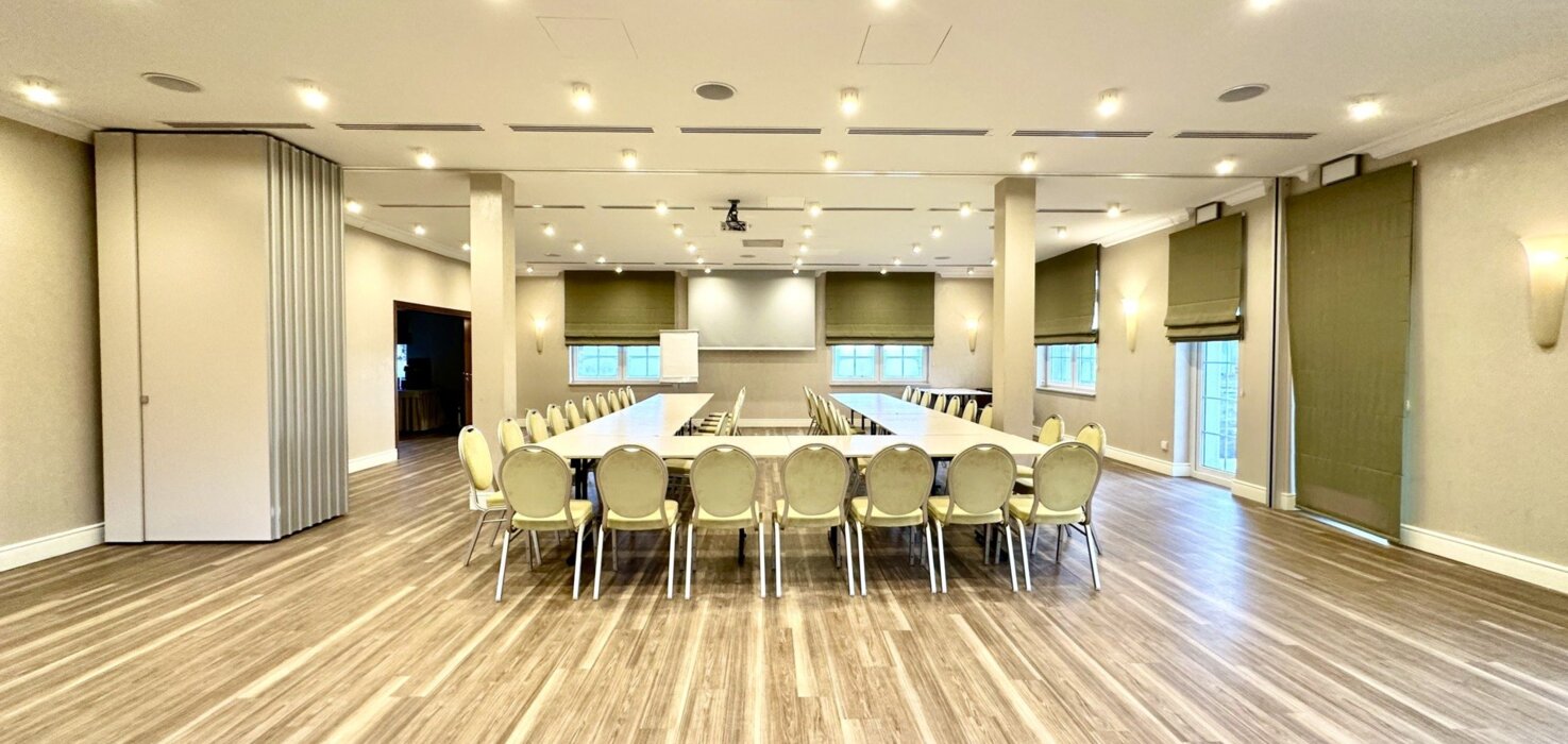 Sala Parkowa o powierzchni 25m2 to idealne miejsce na seminaria, prywatne spotkania czy na posiedzenia zarządu do 12 osób. Salę można wykorzystywać do spotkań mających odbywać się przy dużym wygodnym owalnym stole. Sala wyposażona w klimatyzację, sprzęt audiowizualny, bezprzewodowy internet, oraz przenośny projektor i ekran.